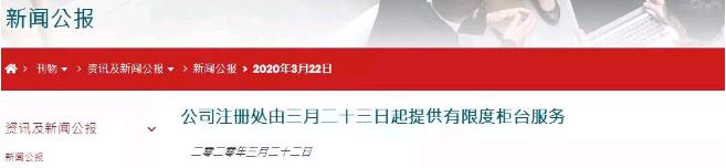 为配合政府在3月21日公布的由3月23日起只提供必要、紧急和有限度的基本公共服务,以减低2019新型冠状病毒病在社区大规模爆发的风险,公司注册处3月22日宣布,该处由3月23日起将在每周的每个工作日提供有限度柜台服务,接收以印本形式交付的文件,以及让客户领取成立公司的注册证明书。