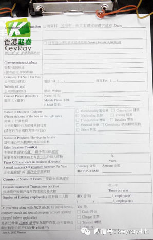 6,稍后前台会拿来表格,要求您填写开户所需基本信息表格。这里是开户过程中比较关键的步骤之一,因为表格中涉及填写您的公司名称、地址、电话这些信息,您可以如实填写国内地址。